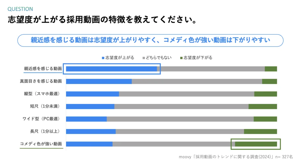 この調査データでは、「コメディ色が強い動画」は志望度が下がる可能性があることを示唆しています。
