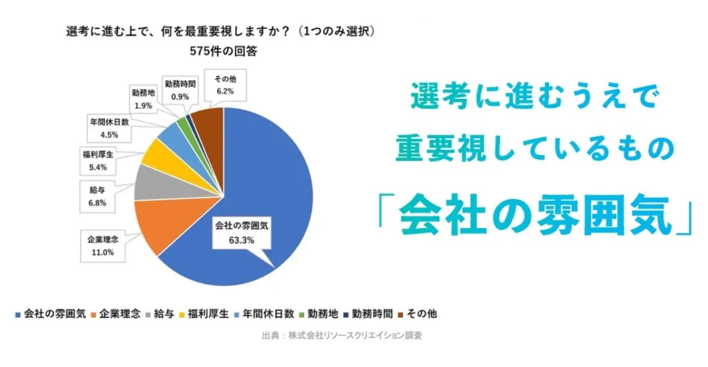 また上記のように求職者は、仕事内容や給料などの定量的な部分をチェックしますが、会社の雰囲気・環境などの定性的な部分も、重視することが分かっています。